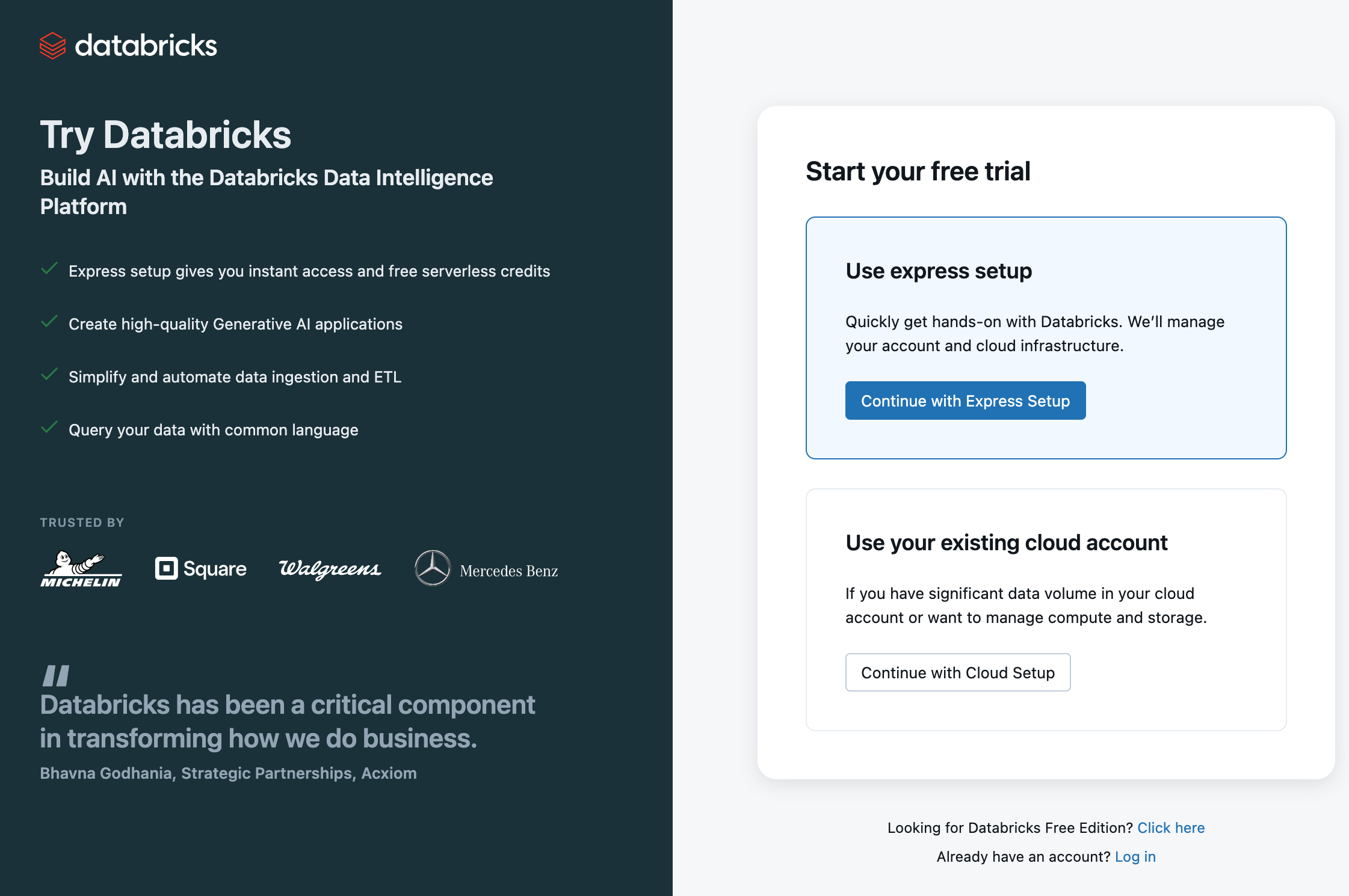 What about trials? You can sign up for a trial, but it has a limited timeframe, and it required access to your cloud account. This means even as you’re taking Databricks for a ‘free’ spin, AWS or Azure or GCP are charging you for any non-serverless cluster compute you spin up. After about a week Databricks salespeople account reps will start pinging you, and eventually it the trial gets shut off. While I haven’t tried in awhile, it looks like the trial experience has been improved with an “Express” option; however, to trial with your existing datalake5 requires you to link a cloud account where the storage and cluster compute are going to siphon some pennies out of your wallet: